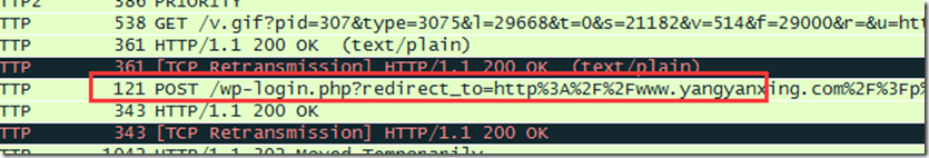 11695 2015-02-11 21:27:19.177156000 192.168.1.102 118.123.116.226 HTTP 121 POST /wp-login.php?redirect_to=http%3A%2F%2Fstatic.yangyanxing.com%2F%3Fp%3D1266 HTTP/1.1 (application/x-www-form-urlencoded)