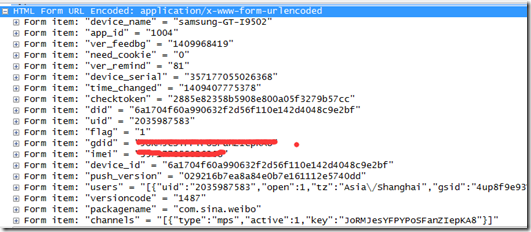 125 2015-02-11 21:25:25.275021000 192.168.1.102 180.149.139.248 HTTP 916 POST /2/push/active?c=android&i=5f61746&s=2602e25d&ua=samsung-GT-I9502__weibo__4.6.2__android__android4.4.2&wm=4209_8001&v_f=2&from=1046295010&gsid=4up8f9e93Tw5PZz2EqMCx8xEv9p&lang=zh_CN&skin=default&oldwm=2468_1001 HTTP/1.1 (application/x-www-form-urlencoded)