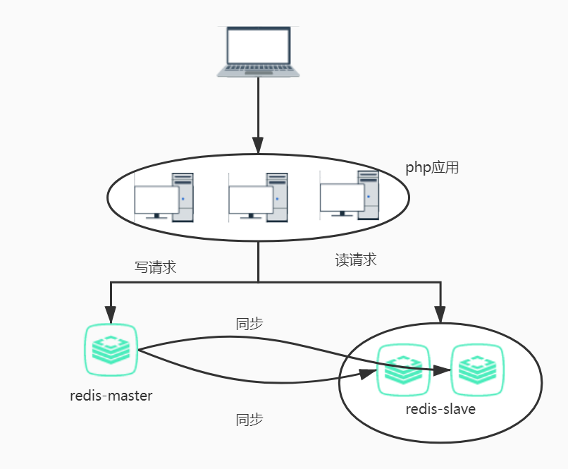 我们通过kubernetes来部署一个应用,这个应用后台是一个php网站,数据库使用redis,redis采用一主两从的部署方式,做到读写分离,写操作走redis主库,读操作走reids从库。并且启动多个应用副本,达到负载均衡,总体的应用架构如下图